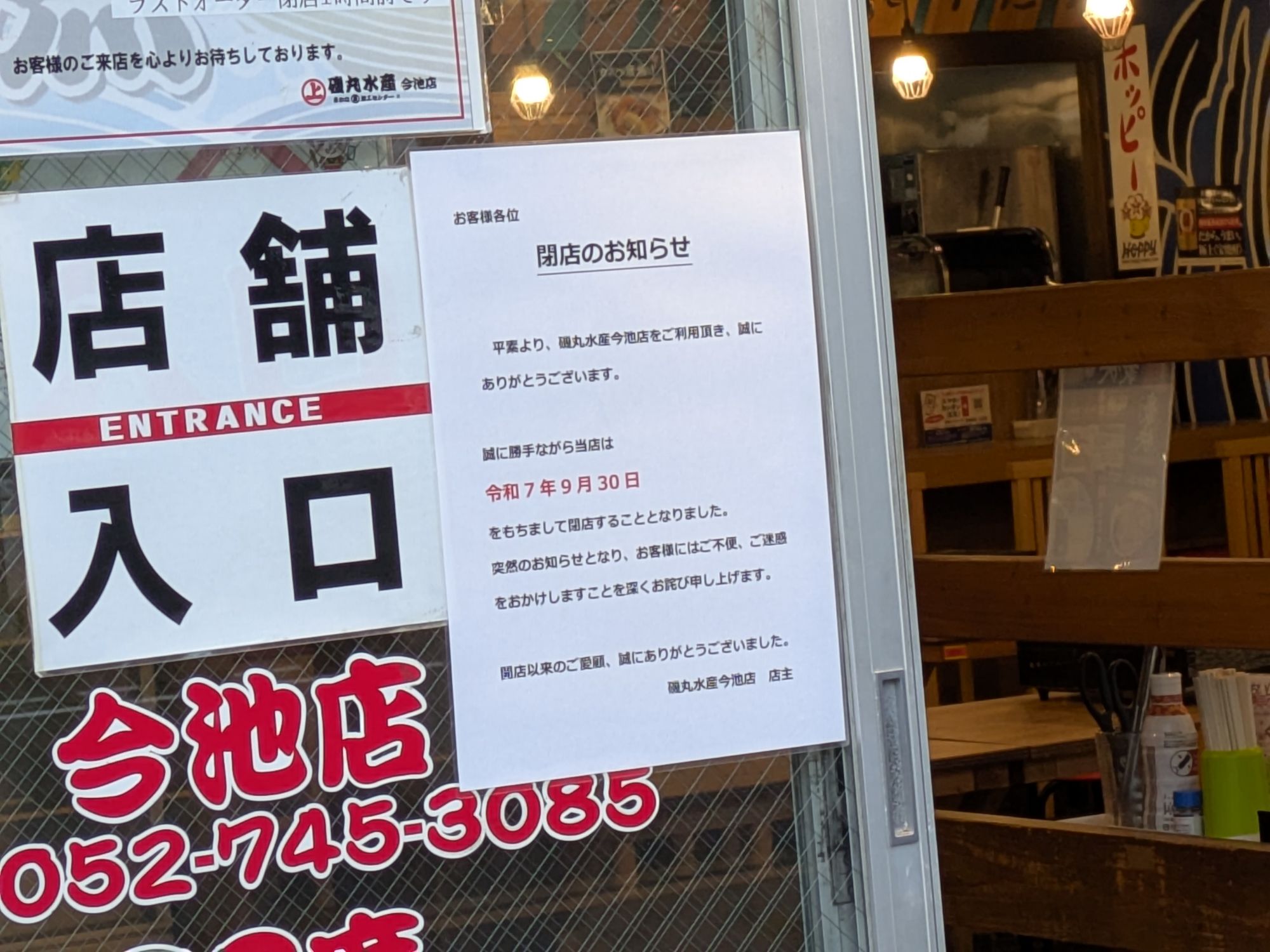 2025年9月30日(火)をもって、今池の「磯丸水産 今池店」が閉店です。